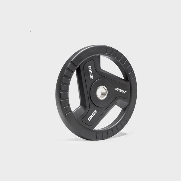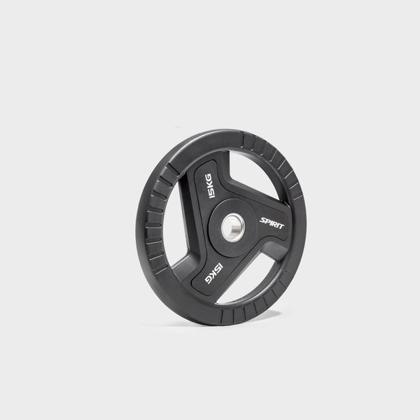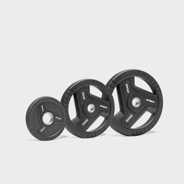 Versatile weight plates with easy-to-hold grips, suitable for use with bars or as free weights.